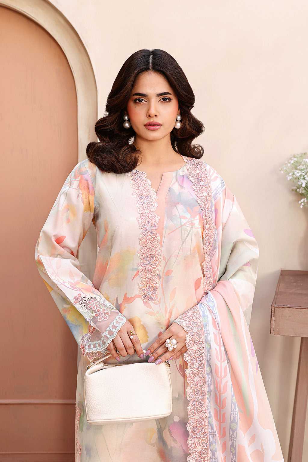 Rawsilk Digital Printed Front Organza Embroidered Patches for Daman Organza Embroidered Border for Neckline Rawsilk Digital Printed Back Rawsilk Digital Printed Sleeves Organza Embroidered Patches for Sleeves Silk Digital Printed Dupatta Organza Embroidered Border for Dupatta Rawsilk Digital Printed Trouser